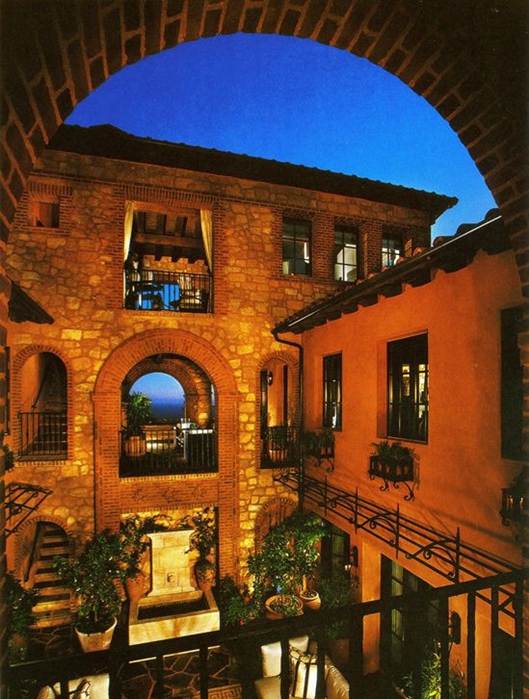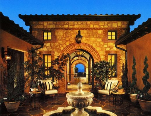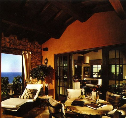 在玄關(guān)前方庭院的上方,這座別墅顯露出了令人驚奇的部分:一個極漂亮的三層第二庭院允許陽光和海岸微風(fēng)滲入并穿透這所雄偉的房子的中心部分。隨著空間連 續(xù)性的展開,整幢房子呈現(xiàn)出了精細(xì)刻畫的石頭和灰泥混合物,在這視覺上把房子與場點(diǎn)的沿海雄偉風(fēng)光連接在了一起。狹長的風(fēng)景帶從后涼廊和露天涼臺的上部延伸到地平線,在這里,海景構(gòu)成了整個房子的一種靜謐感。