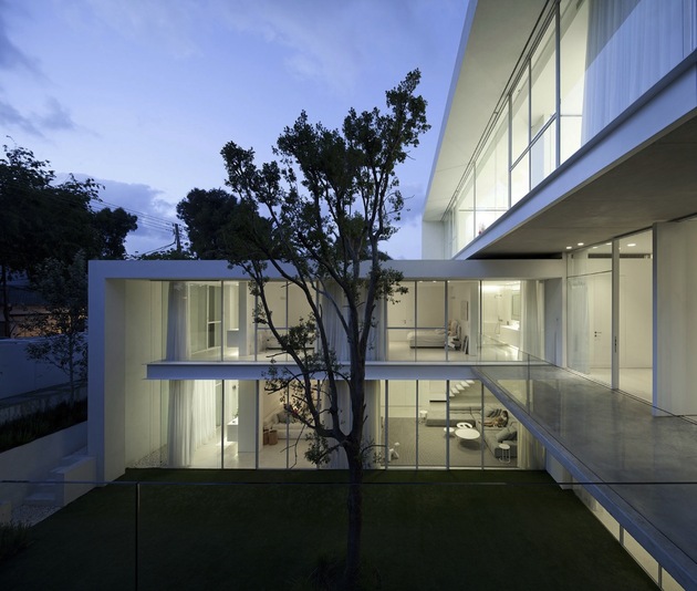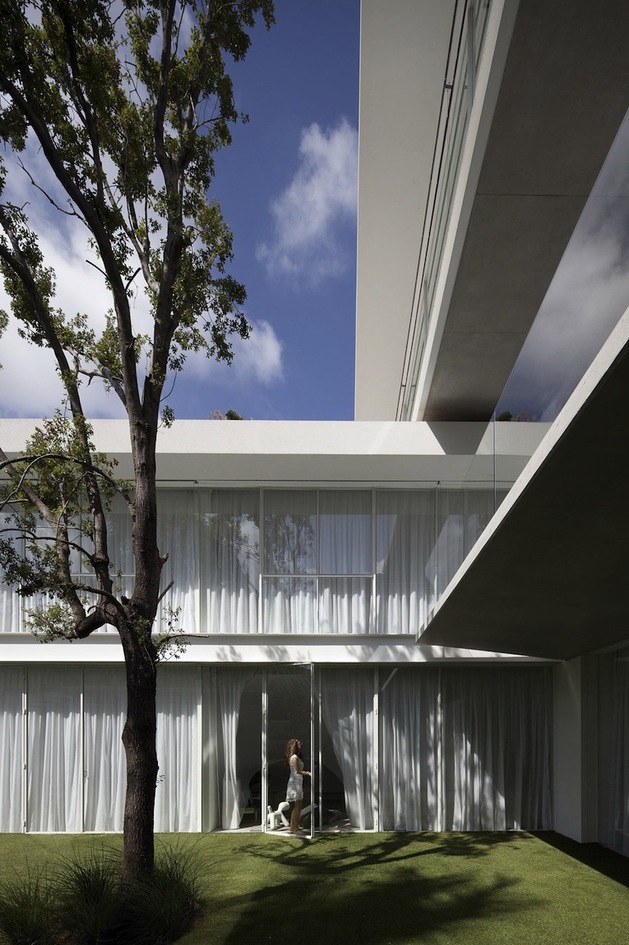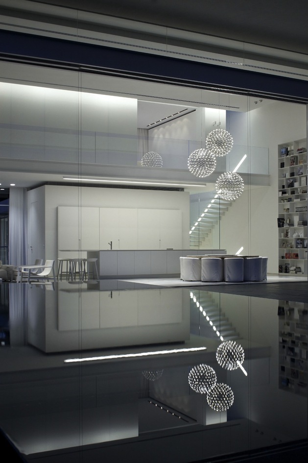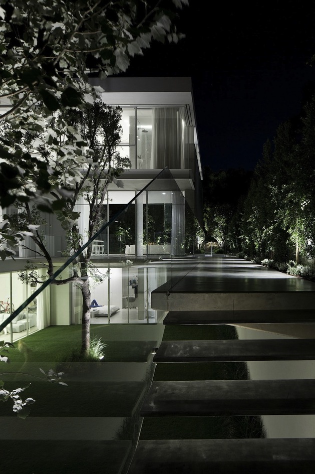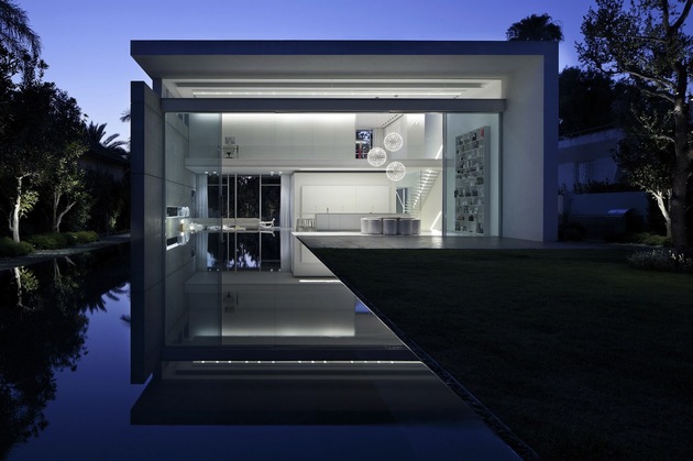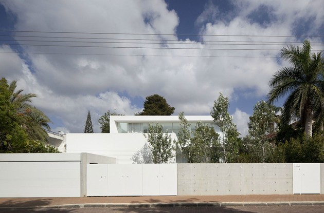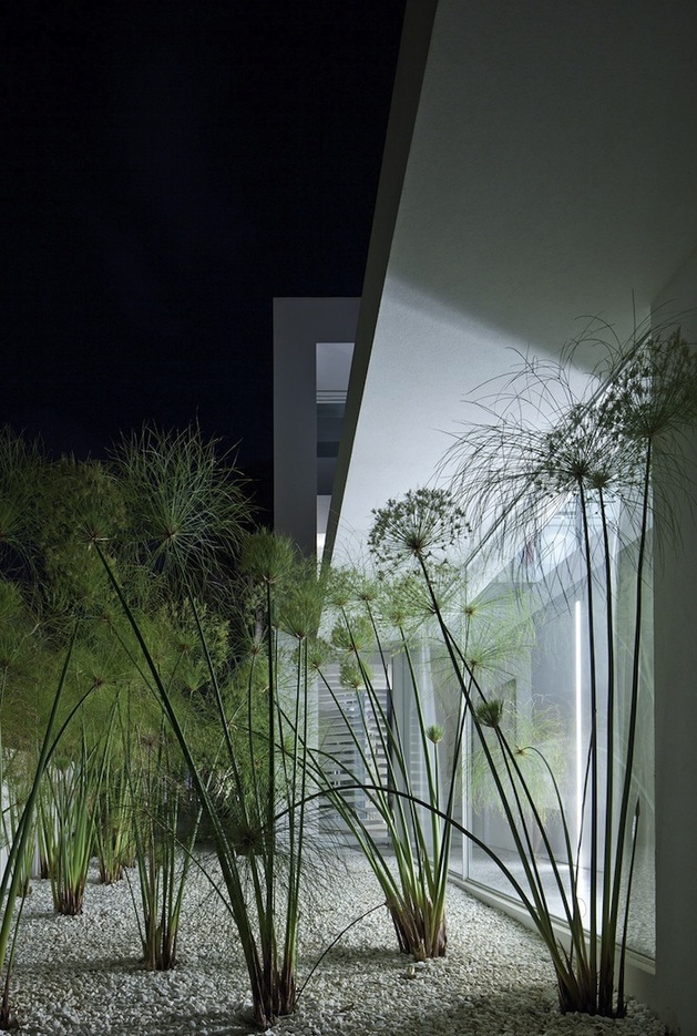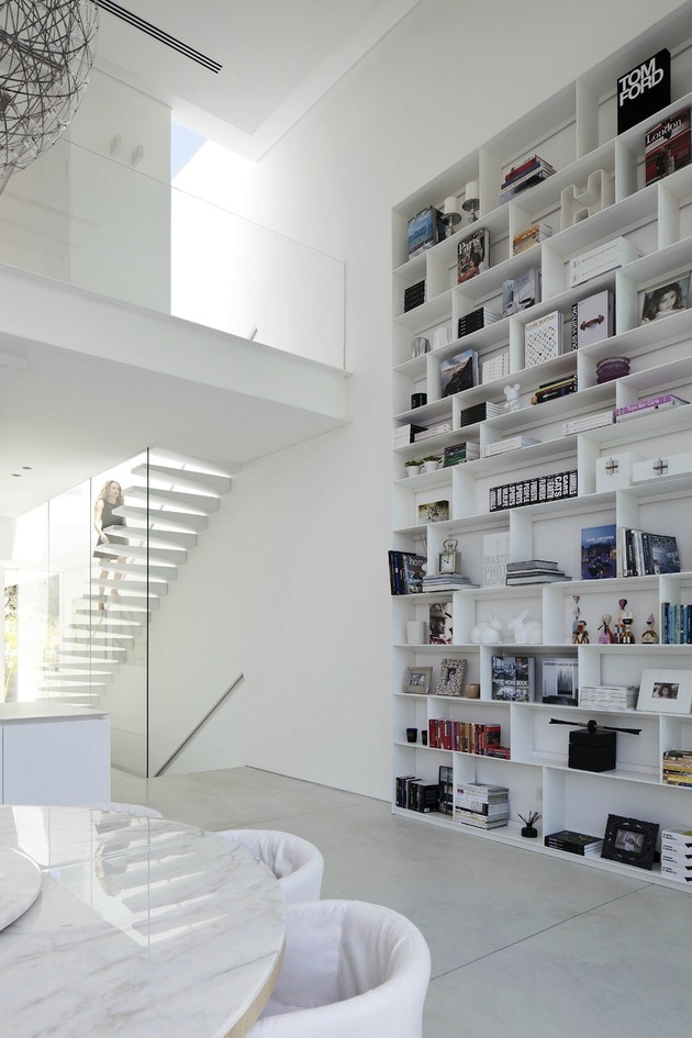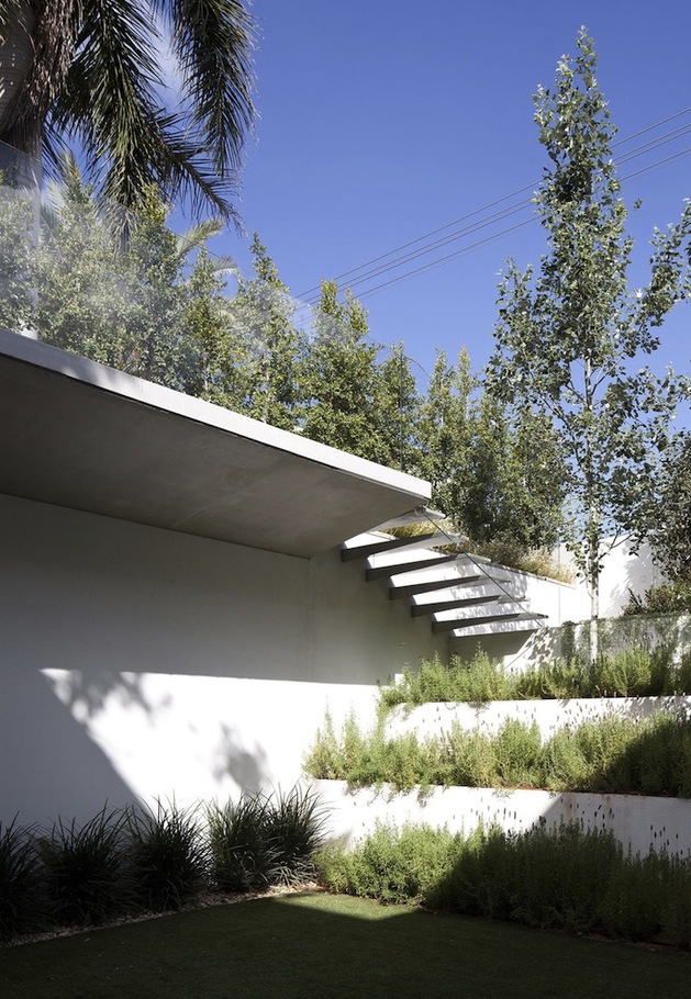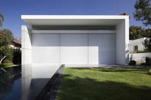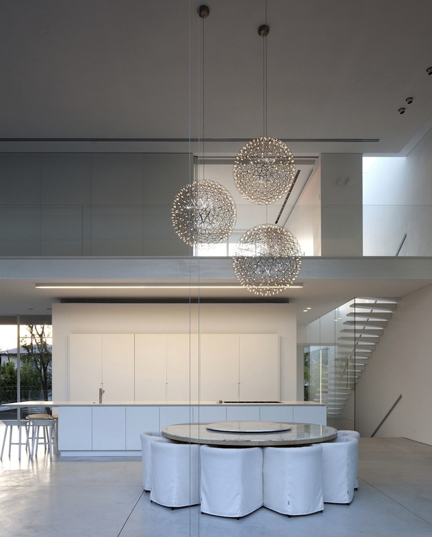 別墅裝修設(shè)計(jì)白色現(xiàn)代簡約別墅設(shè)計(jì)以色列建筑師Pitsou Kedem別墅外觀上用橫平豎直的矩形,白色外墻漆,大面積的落地玻璃向院子開放,院子圍墻很好的保護(hù)了隱私性,室內(nèi)分為前后兩部分,在后方,是個(gè)開放的公共空間,用以日常活動(dòng)和社交聚會(huì),在前面,是對著大門入口的臥室,主人套房占據(jù)了三樓整層。內(nèi)部裝飾也是以白色為主調(diào),連地面也是接機(jī)白色的淺灰,只用了少許布藝,地毯增色,整個(gè)建筑內(nèi)外都透出一種優(yōu)雅,高貴的氣質(zhì)。